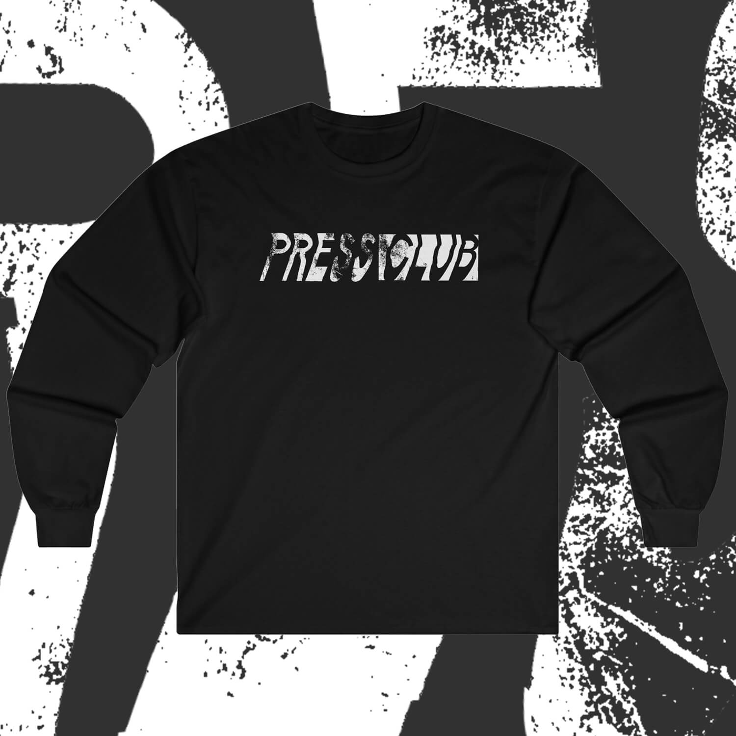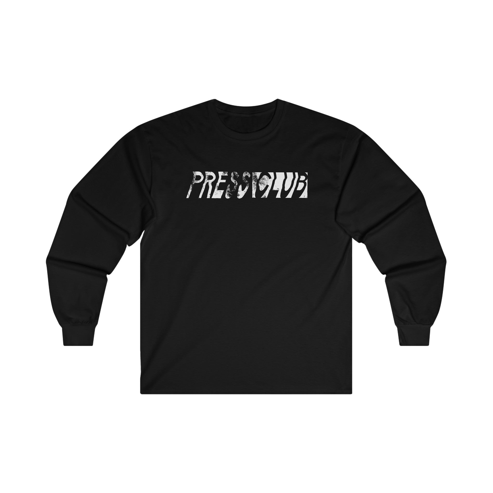 Press Club 'Distressed Logo' Long Sleeve designed by Nat Foster and printed on Black Gildan Ultra Cotton Long Sleeves